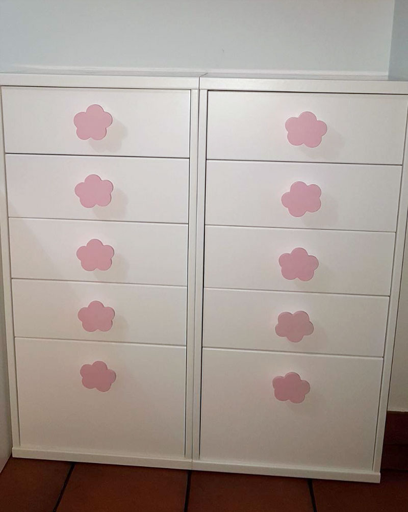 Mira que trabajo de lacado en blanco de muebles de dormitorio infantil. El trabajo de lacado ha se ha realizado tanto en el mueble de aparador con cajones y detalles de pomos en color rosa.